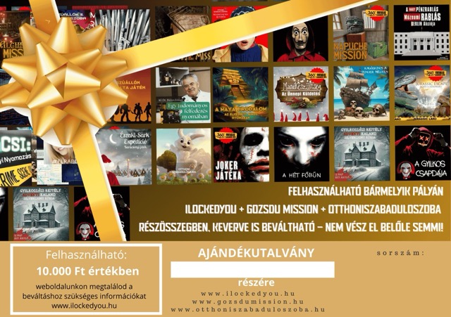 Válaszd ki, hogy kizárólag Budapesti szabadulószobáinkba érvényes utalványt szeretnél, vagy VIP csomagot, mely tartalmaz egy otthon játszható szintén szabadon választható játékot is az otthoniszabaduloszoba.hu kínálatából